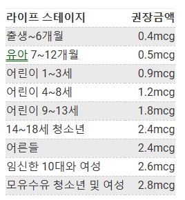 성인 기준으로 하루 권장량은 약 2.4 마이크로그램이니 참고하세요.
